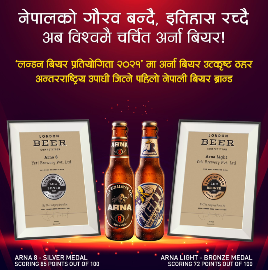 There is no doubt that ARNA Beer has been exceptional in its advertising strategies and stands out from other Beverage companies in the promotion of their product in recent times. Their activities have set a trend and upped the bar. A 500 ml beer bottle was introduced primarily by the ARNA Beer in Nepal. ARNA Beer is the first Nepali Beer brand to get international recognition. They have been awarded for their two variants, “Arna 8” and “Arna Light” in the “London Beer Competition” with silver medal and bronze medal respectively.